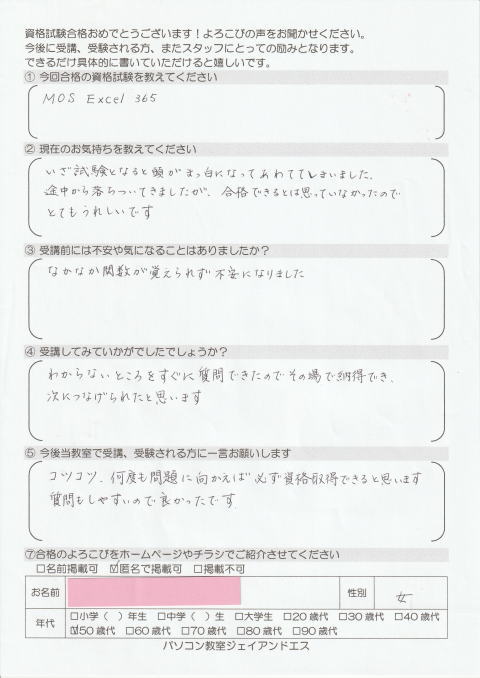 途中から落ちついてきましたが、合格できるとは思っていなかったのでとてもうれしいです。