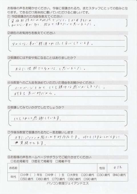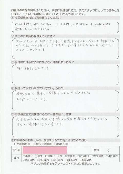 WordやExcelは大学で少しやった程度だったので、こちらで受講させていただき、わからないところは先生にすぐ聞くことができたため、とてもありがたかったです。